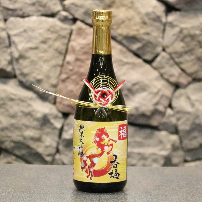 2026年の干支「午」をデザインした特別ラベルと、お正月らしく華やかな水引を一緒にパッケージングしました。