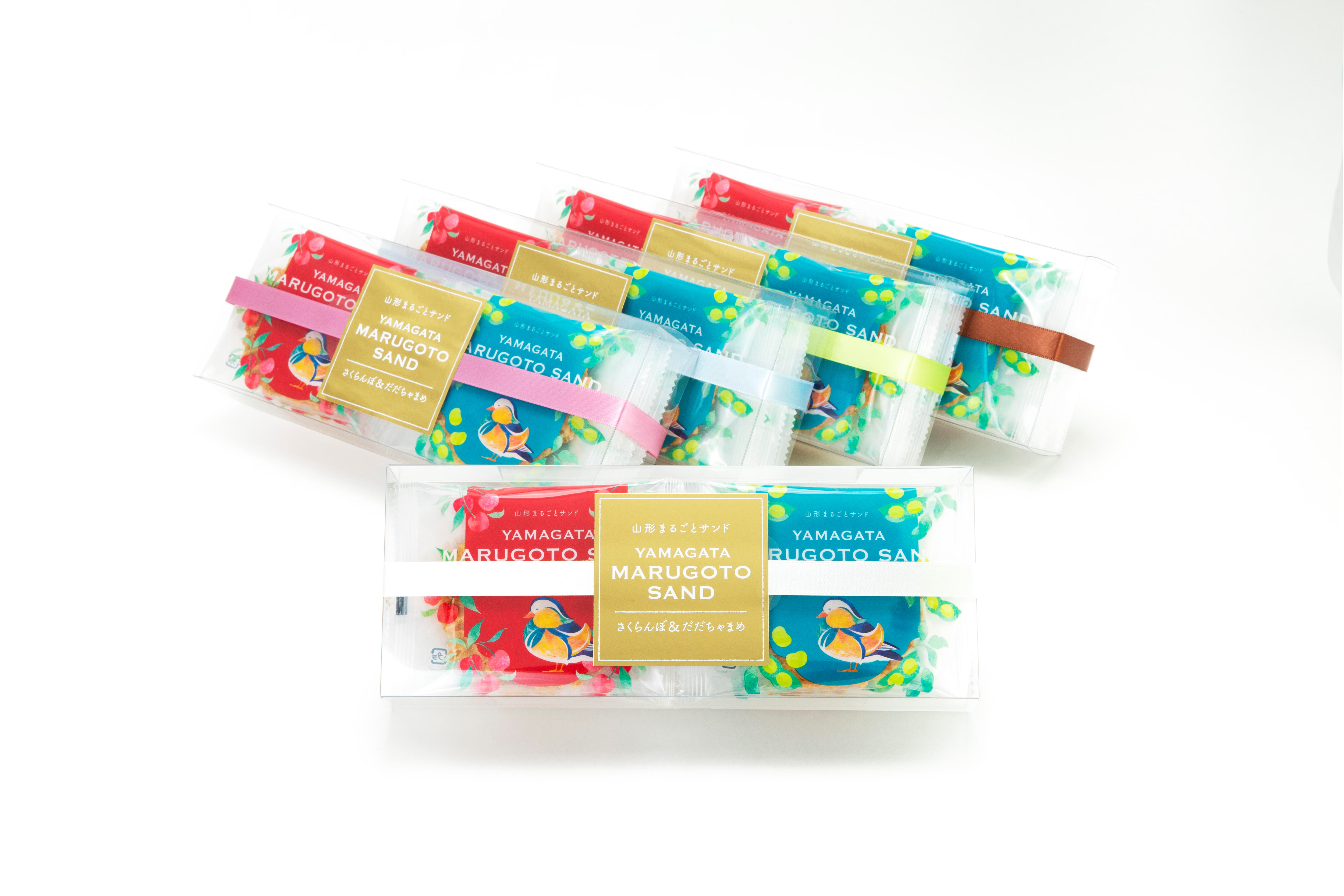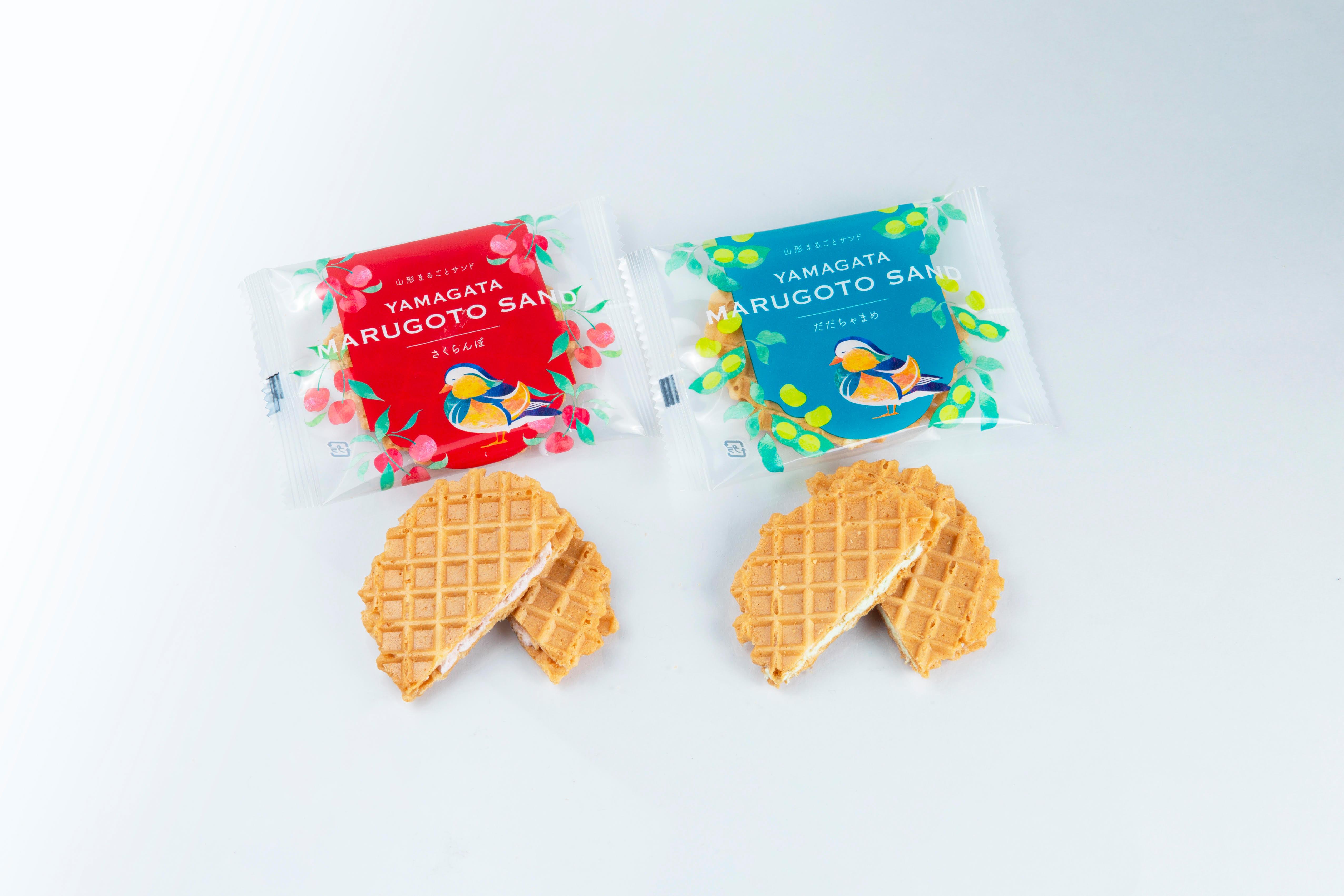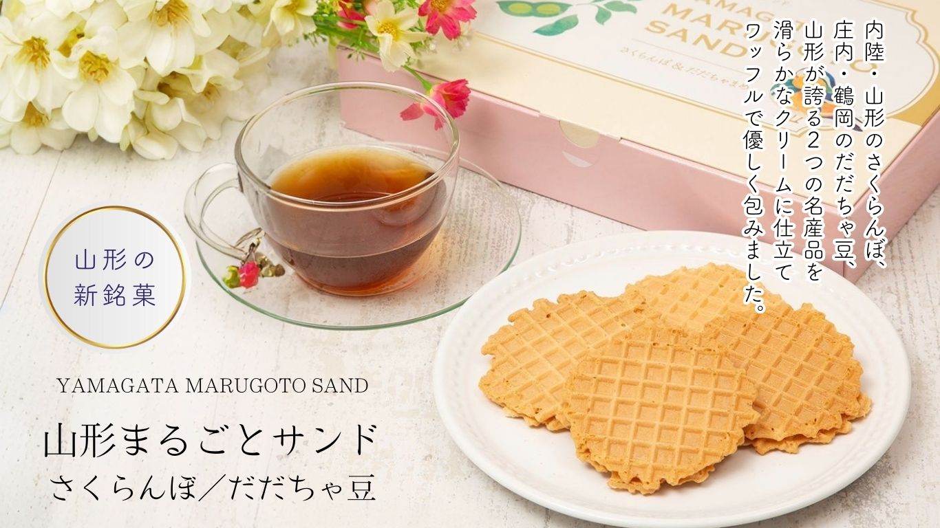 からから煎餅でお馴染みの山形県鶴岡市の「宇佐美煎餅店」が、山形県の誇る二大特産品を主役にした『山形まるごとサンド』。山形の新しい定番土産としておすすめです。