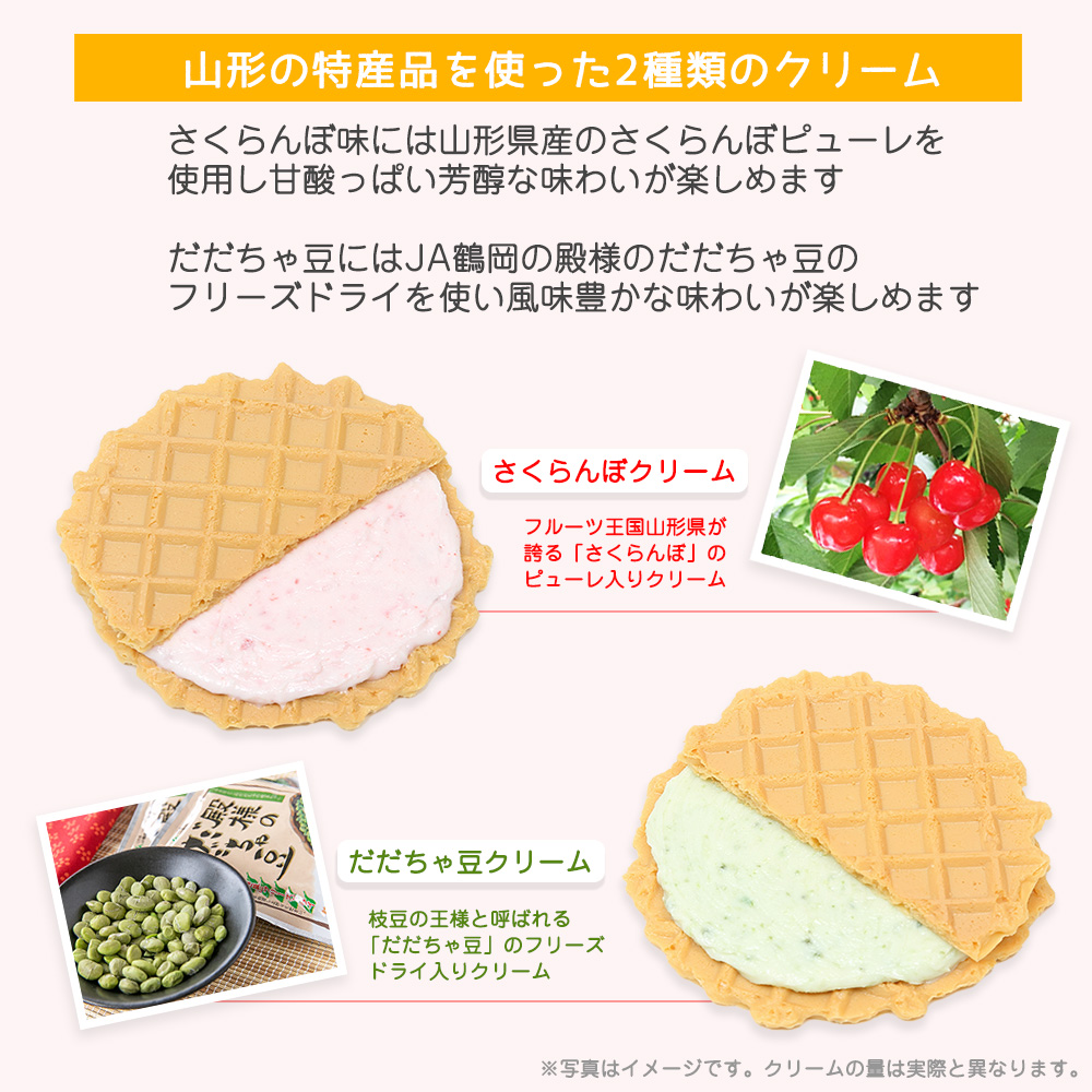 さくらんぼは、もぎたての果実を思わせる爽やかな甘酸っぱさを。だだちゃ豆は、噛むほどに広がる独特の深いコクと香ばしさを、それぞれなめらかなクリームに閉じ込め、丁寧に焼き上げたパリッと軽快なワッフルでサンドしました。